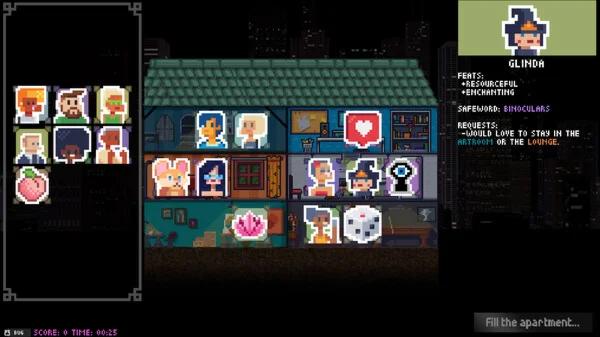 Open your doors to a cast of procedurally generated guests, all with unique quirks, desires and tastes. Place them together in pairs (or groups) and maybe nudge in some interesting activities.