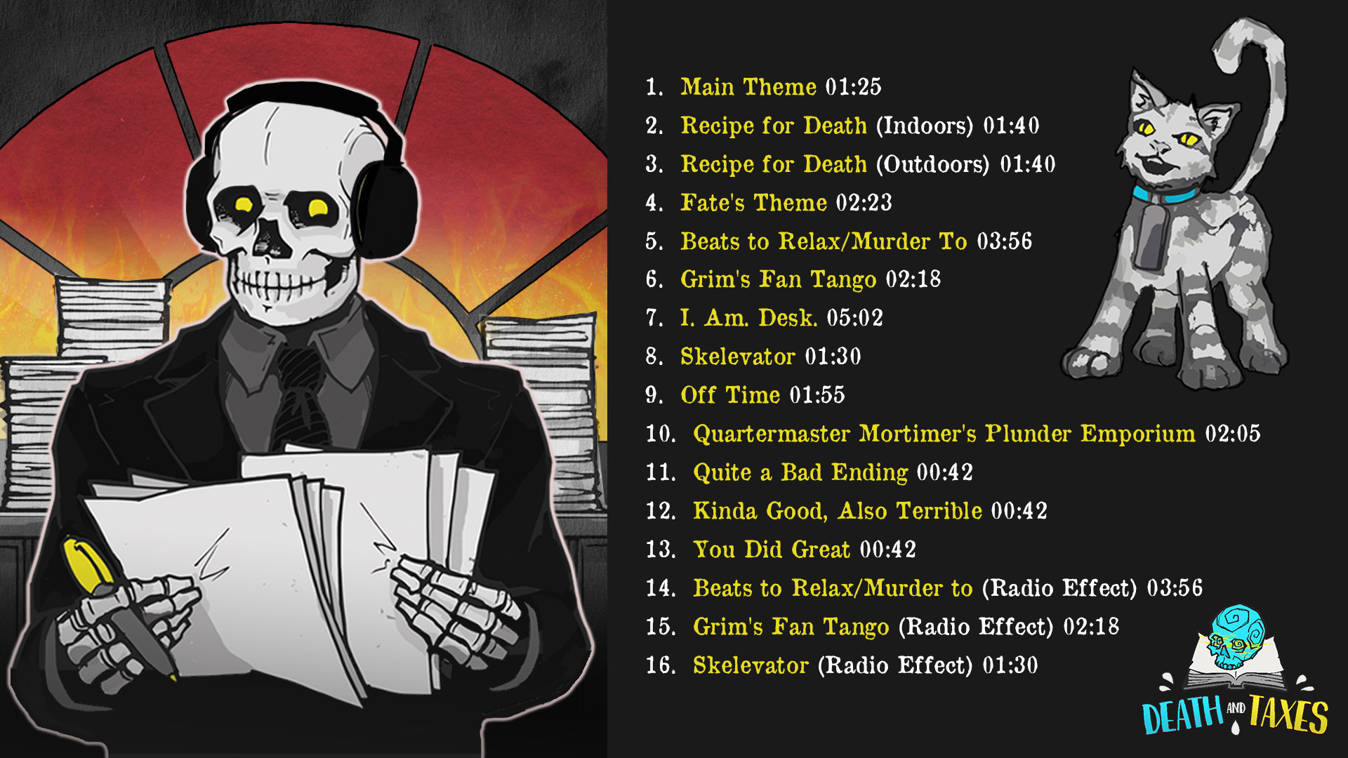 The mellow and funky 16-piece soundtrack of Death and Taxes in high fidelity and crisp quality, free of charge if you own the base game!