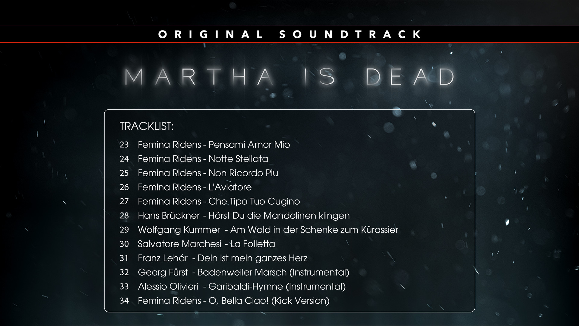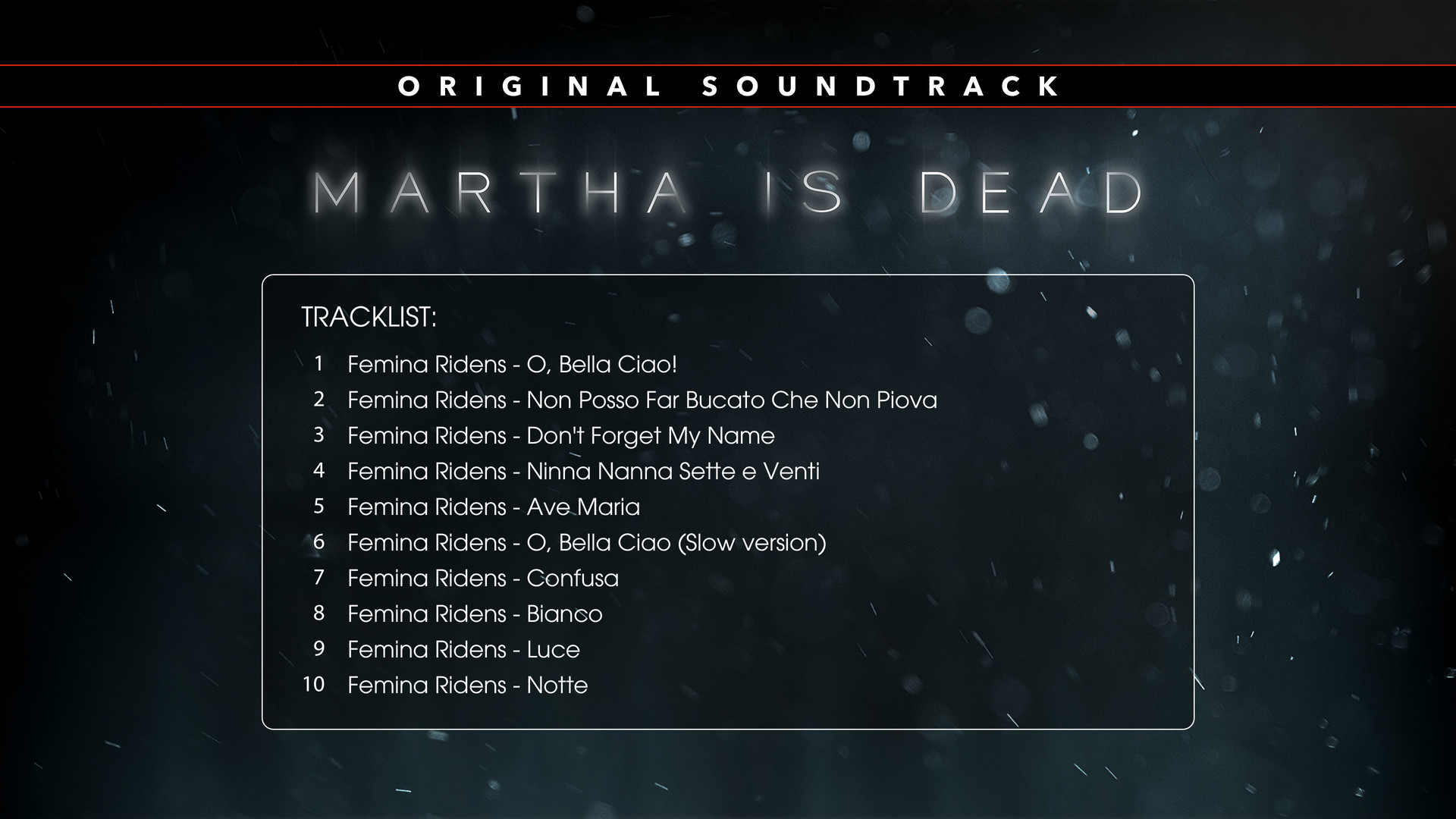 Прочувствуйте в полной мере дух Martha Is Dead с помощью саундтрека из игры: почти два часа завораживающей эклектичной музыки, которая одновременно напоминает об историческом периоде, в который происходит действие, и усиливает зловещую атмосферу.