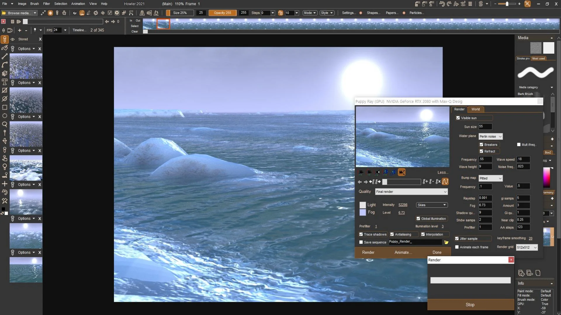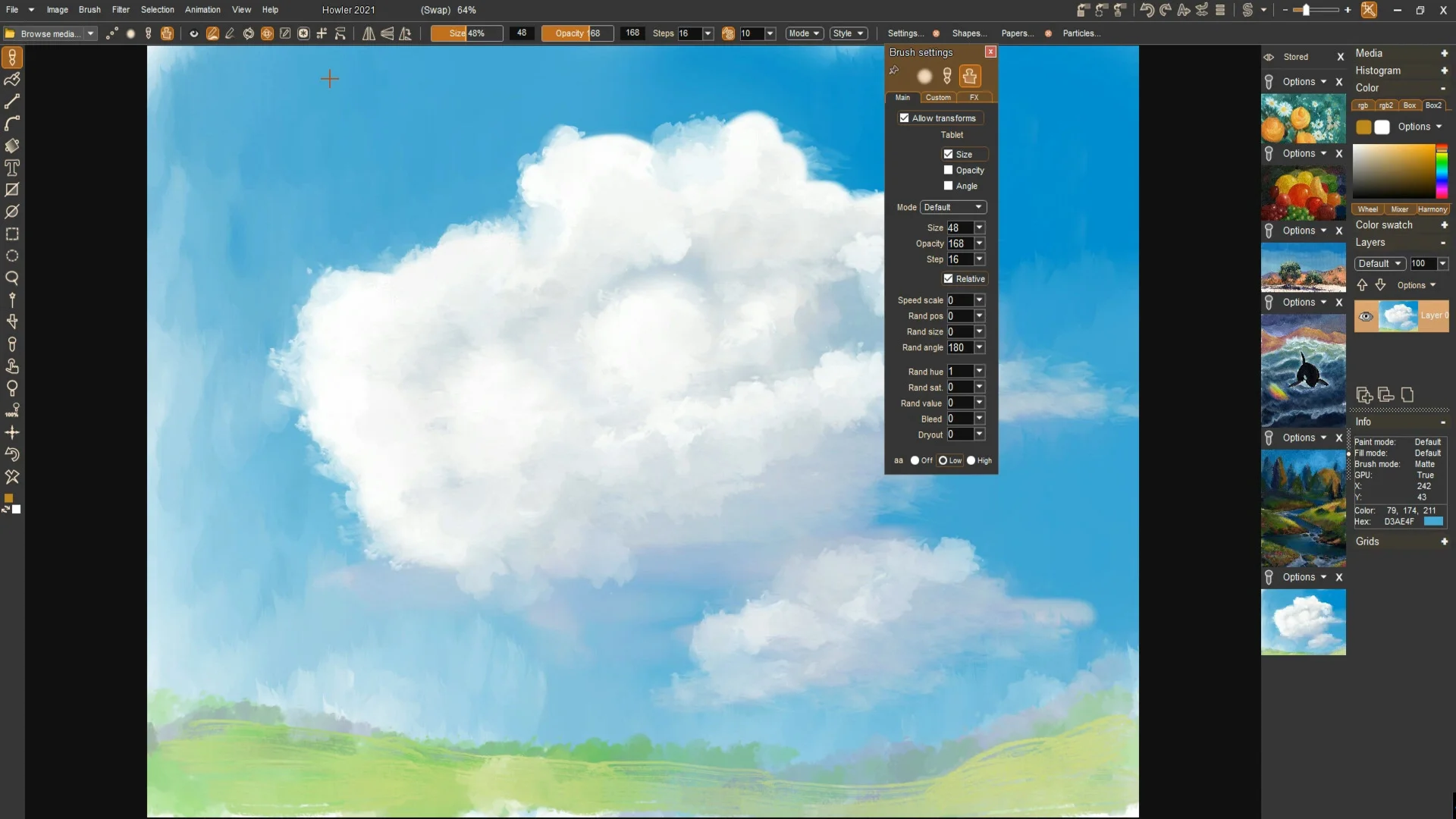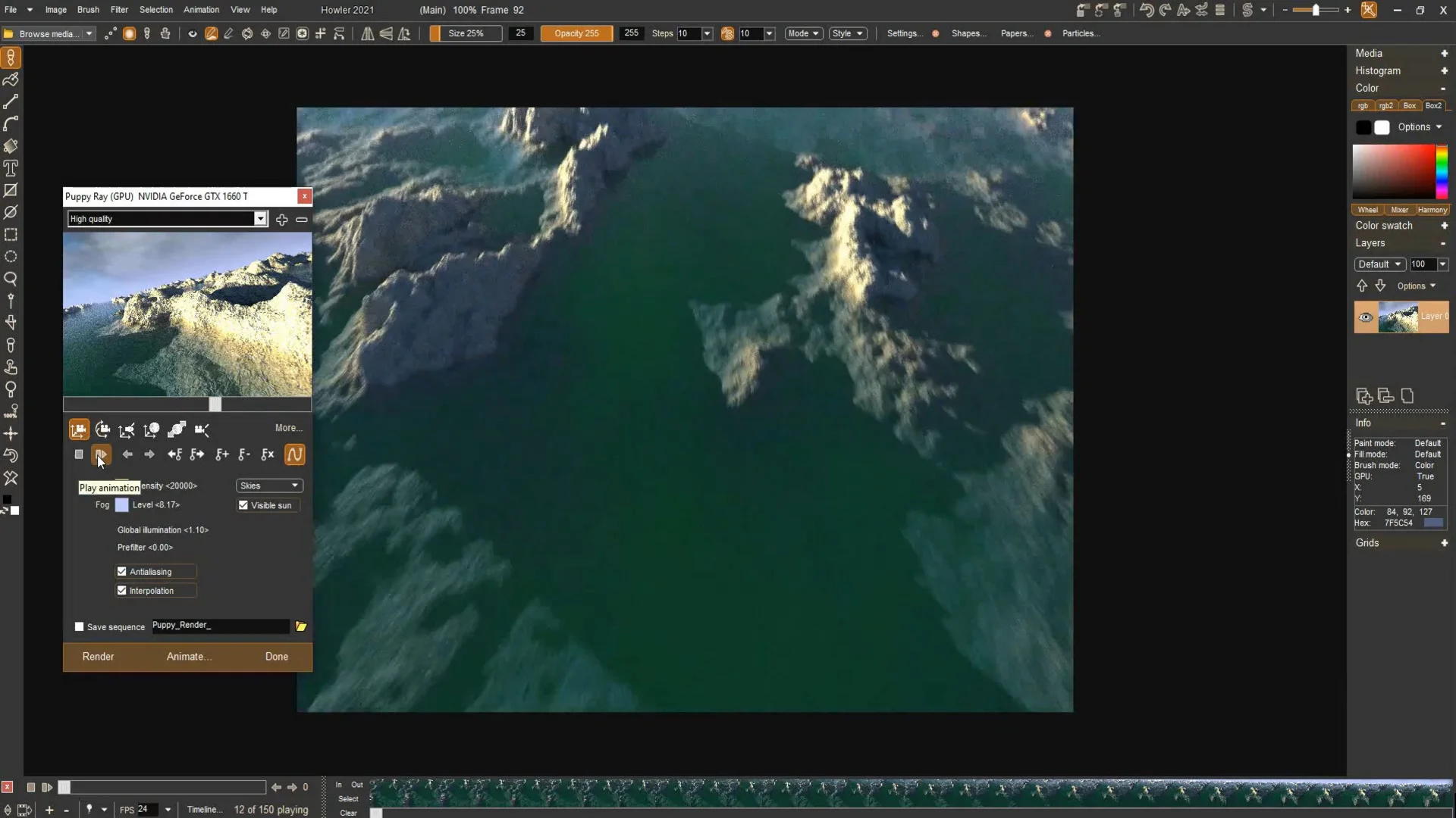 PD Howler - это быстрая программа для цифровой живописи и анимации, т.е. творческое программное обеспечение для вашего ПК.Серия программ для цифровой живописи и визуальных эффектов PD Howler вернулась с PD Howler '21 (версия 14). Приложение значительно расширилось, улучшились инструменты рисования, анимации, 3D и Visual FX.Мы получили инструменты для генерации 3D-ландшафтов с GPU-ускорением, рендеринг с трассировкой траектории, рисование видео на видео, отслеживание движения, стабилизацию изображения, ротоскопирование, руководства художника, редактирование фотографий, рисование реалистичных сред с высыханием, полупрозрачностью и поднятием пигмента, инструменты для пост-работы и фильтры спецэффектов, растяжение времени с интерполяцией по оценке движения, кисти частиц, кисти листвы, кисти щетины, кисти орбикул, пользовательские анимированные кисти, кисти для видео, лист экспозиции для синхронизированной по губам мультипликации, анимированное рисование кадров, инструменты для создания зацикленного и бесшовного видео, потрясающие блики на линзах и многие другие удивительные инструменты и приспособления.