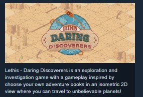 Lethis - Daring Discoverers is a 2D isometric exploration and investigation game where you can travel to planets, each more bizarre than the last. With a game system based on choose your own adventure books, you must find a way of stealing the artefacts hidden on each planet.