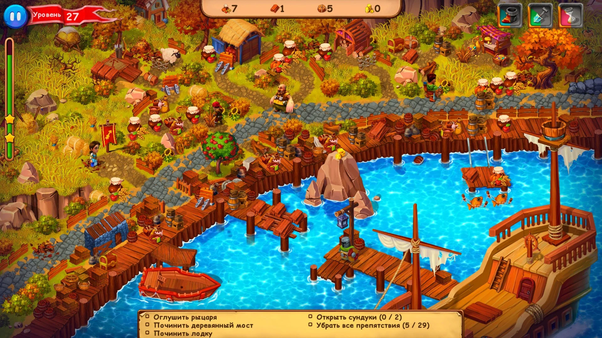 Сюжет новой игры «Робин Гуд» довольно прост. Когда король Ричард отправился в крестовый поход, править за него остался Ноттингемский шериф, жадный и алчный. Он в кратчайшие сроки навел в королевстве свои порядки. Теперь крестьяне задавлены налогами, деревни разрушены, а стражники, сборщики налогов и рыцари отбирают у людей последнее. А самое страшное, что шериф украл деньги, предназначенные для выкупа короля из плена!Конечно же, на защиту простых людей встал народный герой Робин Гуд. Со своей командой, знакомой нам по фильмам и книгам, Робин творит добро и наносит пользу: отстраивает пострадавшие от бесчинств стражников дома и деревенские здания, помогает голодающим крестьянам. И гоняется за шерифом, чтобы забрать деньги, которые помогут вернуть короля. Заодно Робин заманивает стражников в творчески сконструированные ловушки.В игре есть несколько ресурсных зданий. Фермы поставляют провизию, лесопилка – дерево, прииск и гильдия воров – монетки, а веревочная – веревки. Веревки, кстати, можно добыть и другим способом: остричь овечку, на которой спустя некоторое время шерсть отрастает снова. Никакой магии и маны у Робина и его спутников нет, поэтому они выкручиваются подручными средствами и активно применяют хитрость, ловкость и другие свои качества. Например, Мэриан обезоруживает рыцарей, пококетничав с ними, а Джон разбирается с ними кулаками.Два режима прохождения игры помогут игрокам с разным подходом к игре. В легком режиме нет ограничения по времени, а обычный рекомендуется для игроков, уже знакомых с казуальными играми, в нем игра идет на время. Для игроков, играющих в обычном режиме, пригодятся бонусы: ускорение бега персонажей, ускорение работы и добавление 30 секунд к времени уровня. Все эти бонусы довольно быстро заряжаются, и если не забывать их включать, то можно существенно облегчить прохождение уровня.