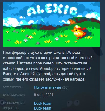 Значит, слушай. Alexio - платформер про утёнка Алёшу. В день своего шестилетия он узнал от отца, как получить свою Монобровь и уже на следующий день отправился в путь! Вместе с Алёшей ты преодолеешь луга, озеро, леса, горы, пещеры и древние развалины на пути к храму, где его ожидает заслуженная награда. Интригует, правда? Жми старт!