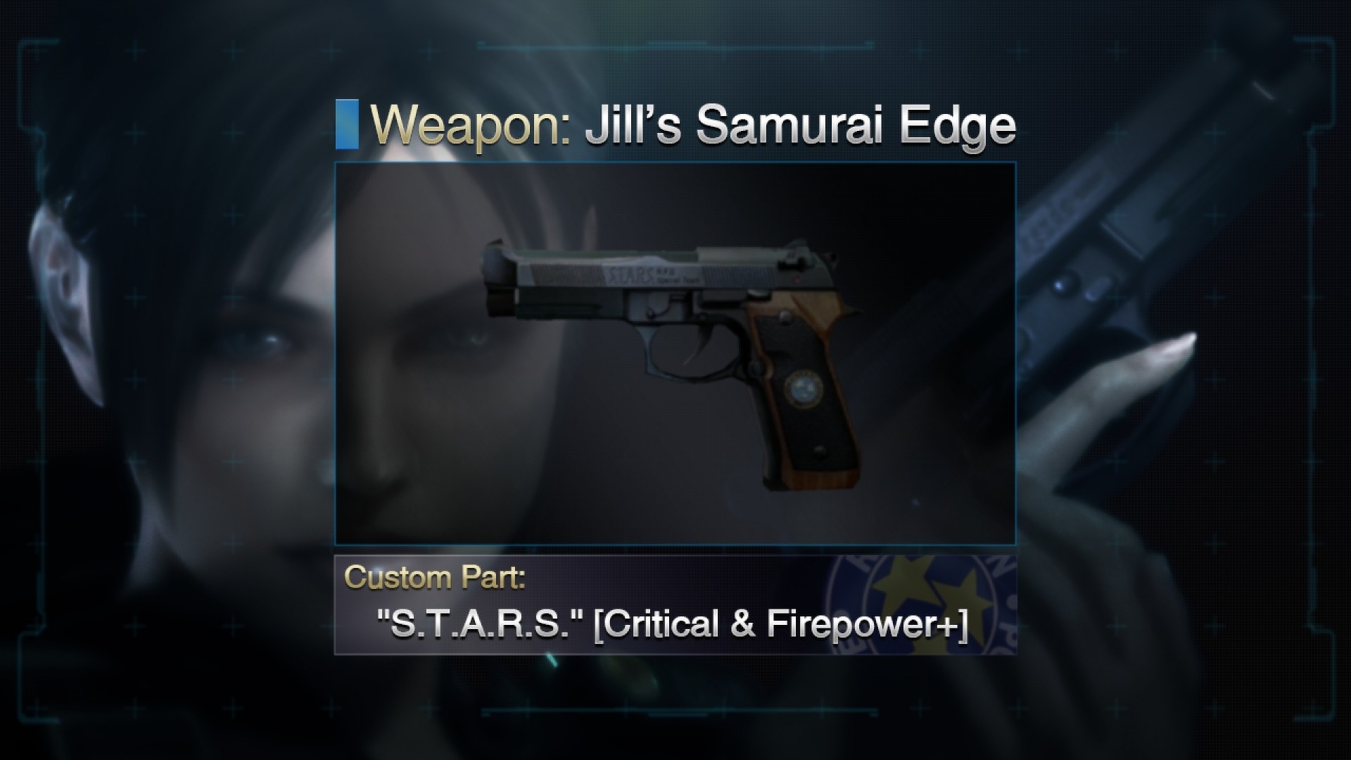 Downloadable content that includes a weapon plus one custom part. This handgun was originally based on the custom M92F "Samurai Edge" that Jill used during her time in S.T.A.R.S., but it has since been changed to the M9A1 and refined to match modern tastes.