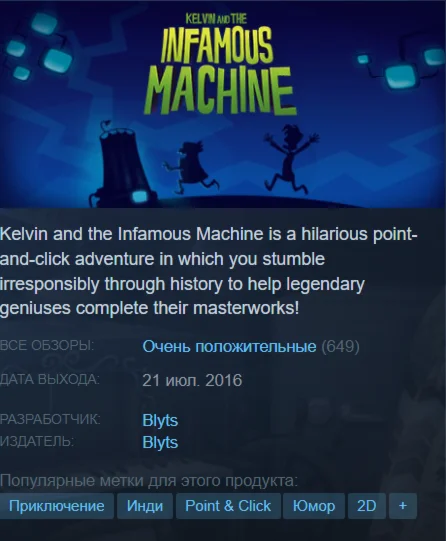 Kelvin and the Infamous Machine is a hilarious point-and-click adventure in which you stumble irresponsibly through history to help legendary geniuses complete their masterworks!