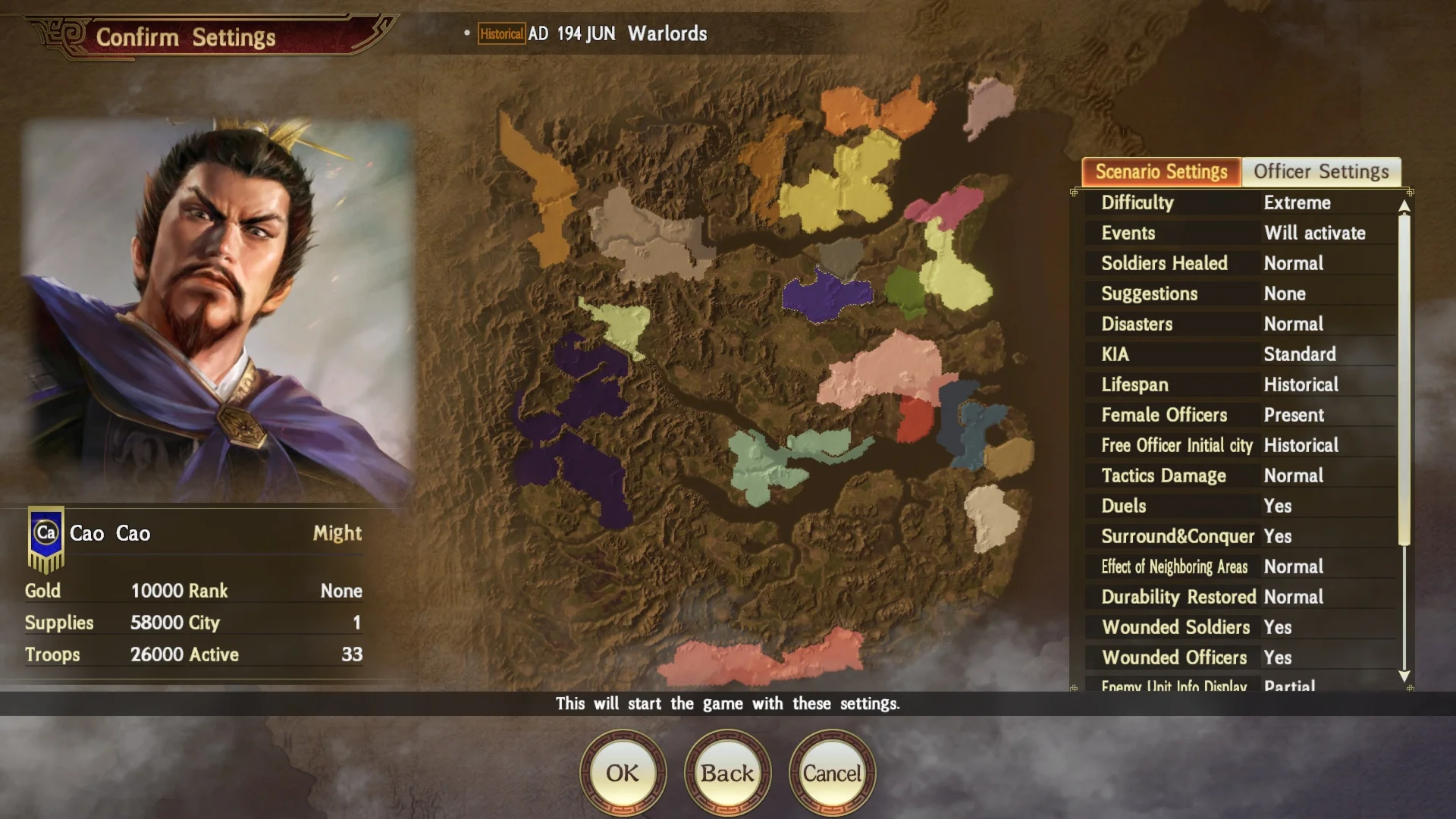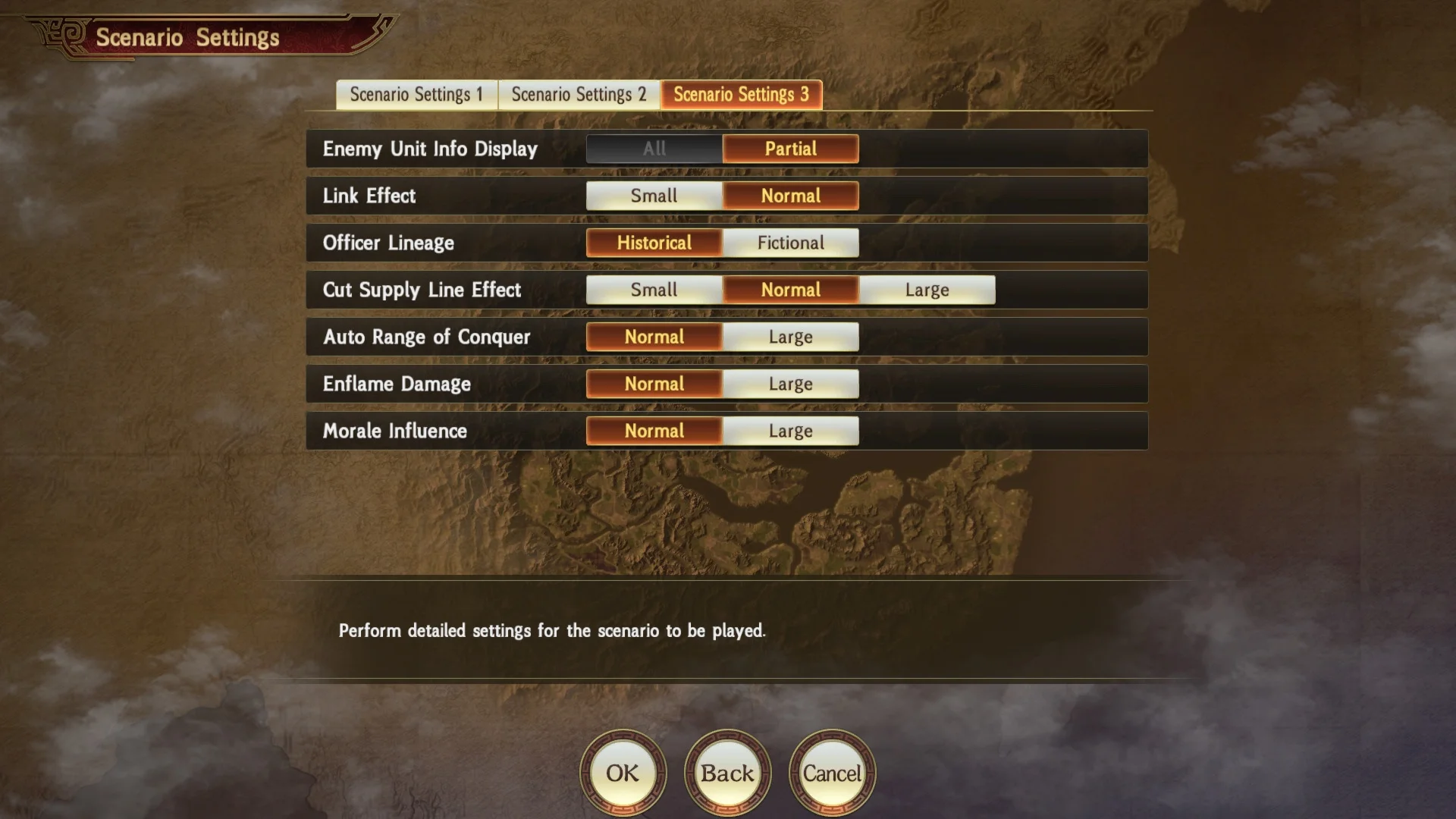 "Scenario Settings" will be displayed for selection upon starting any scenario from "Start New" on the start menu.