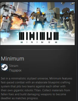 Минимум, действие которого происходит в минималистической стилизованной вселенной, предлагает динамичные бои с тщательно продуманной системой создания чертежей, в которой две команды сражаются друг с другом с помощью своего собственного гигантского роботизированного Титана. Собирайте материалы с павших врагов и создавайте разрушительное оружие, которое станет еще более смертоносным по ходу матча.