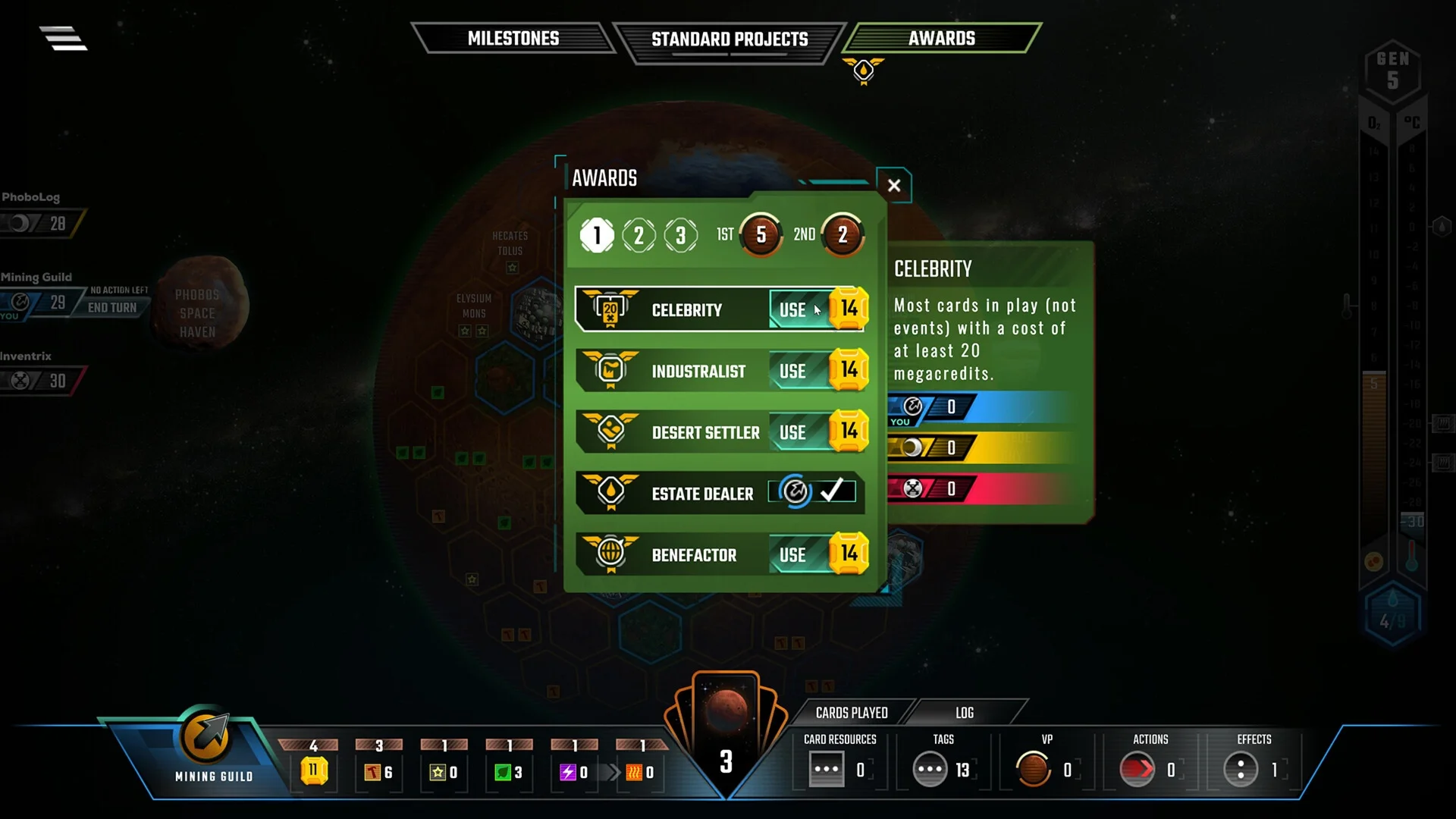 Each map also changes the Awards and Milestones present in Terraforming Mars. From the Space Baron award and Polar Explorer milestone of Hellas to the unique Estate dealer tile objective of Elysium, be prepared to seize new strategic opportunities!