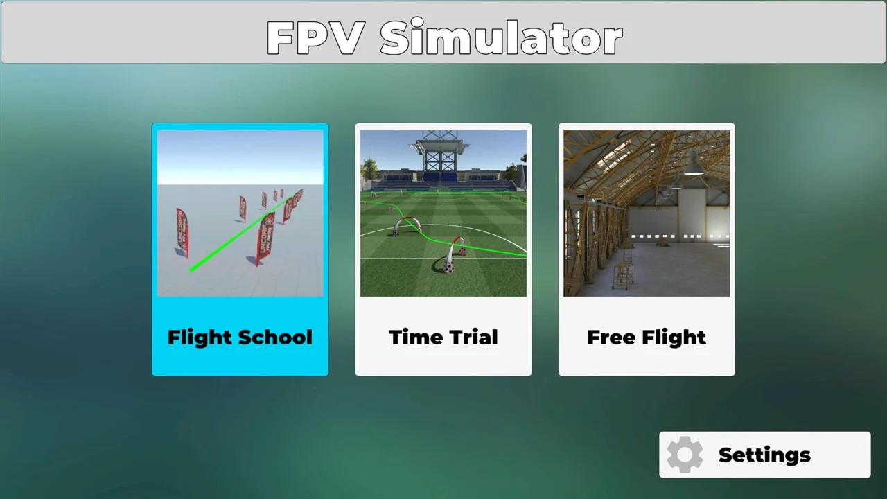 If you are total beginner pilot you can complete the flight school which teaches you the fundamental fpv drone racing gates and controls. Predefined settings help you to get into the world of FPV Racing. Take one step at a time and start with beginner mode. After you get comfortable with the controls, get to the next level with the intermediate mode and finally advance to the pro mode which unlocks the full potential of FPV like freestyle and fast racing. Setup your stick sensitivity in the settings tab and use from predefined values to create your customized stick setup. Two game modes are included namely the Time Trial mode where you try to beat your last best time and free flight mode where you can fly around and do some freestyle tricks or other stuff.
