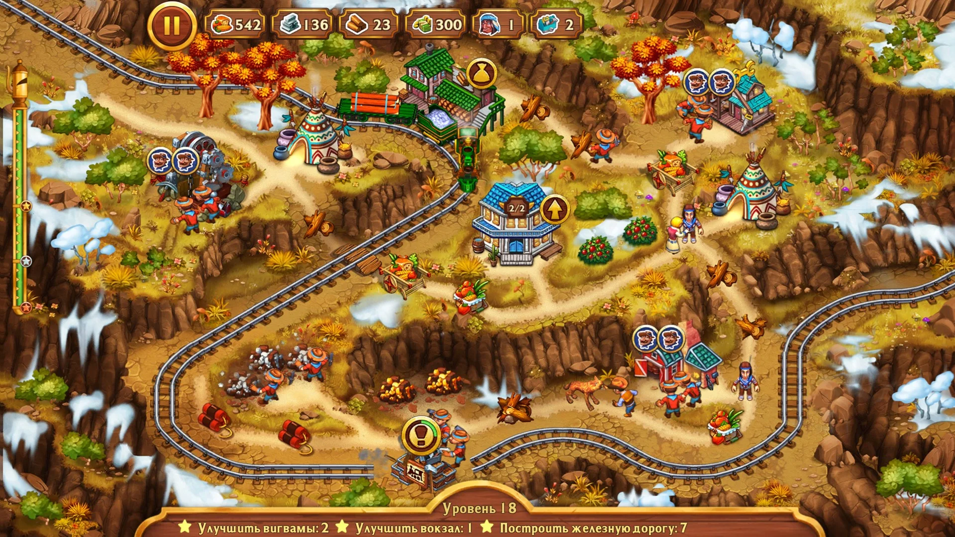 Грядет золотая лихорадка, и ваша задача — проложить путь к богатствам!Проложите железнодорожные пути через прерии и горные хребты, чтобы потенциальные старатели могли добраться до Клондайка и заявить о своих правах на земли. Налаживайте торговые пути и договоритесь с туземцами о строительстве. Используйте деловую смекалку, чтобы создать честный рынок и вытеснить жадного предпринимателя из бизнеса.Звучит просто, как пара щелчков мыши!Вам также предстоит сопровождать Джека и Джилл на 50 захватывающих уровнях кампании и 10 бонусных картах, где они должны восстановить заброшенные деревни и вдохнуть новую жизнь в бесплодные земли. При этом необходимо укладываться в отведенное время и стараться получить преимущества, которые помогут вам победить.Сможете ли вы приручить Дикий Запад? Доберетесь ли до Клондайка? Хватит ли у вас навыков, чтобы разблокировать все преимущества и достижения? Скачайте «Золотые рельсы: Дорога на Клондайк» и играйте уже сегодня!