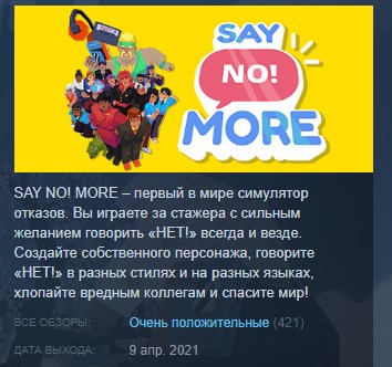 Say No! More – первый в мире симулятор отказов. Управлять персонажем проще простого. Пройдите рабочий день по готовому маршруту в развеселом офисе. Вы не только сможете кричать «НЕТ!» на своем языке, но еще и с различными эмоциональными окрасками, чтобы дать коллегам отпор. Сбивайте их с толку различными действиями, а затем крикните «НЕТ!» с удвоенной силой, пока они пытаются понять, что происходит.