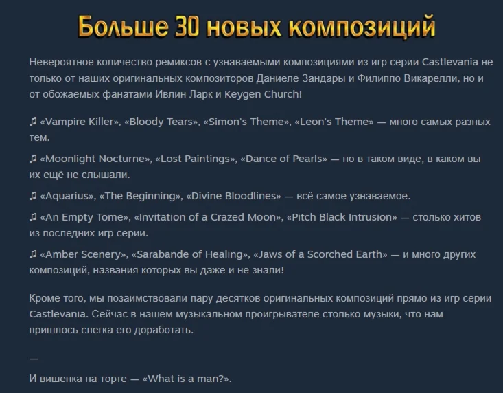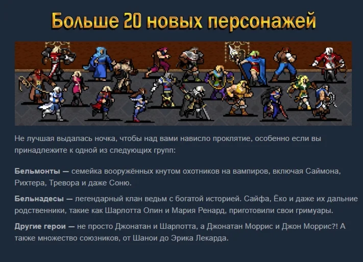 Над замком Дракулы снова село солнце, и с восходом луны на свет повылазили жуткие твари и чудовища, знаменуя собой очередной виток борьбы добра со злом. Воспользуйтесь целым арсеналом нового оружия, специально созданного для борьбы с нечистью, и оставьте от полчищ врагов лишь пепел, прежде чем столкнуться лицом к лицу с самим воплощением зла. Обратите свой взор на тени, нависшие над вашими героями, ведь ваши приключения только начались! Градус серьёзности у нас неимоверно зашкаливает, так что вперёд — исследуйте мир «Кастлвании» в Vampire Survivors!
