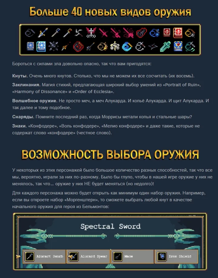 Для каждого персонажа можно будет открыть как минимум один набор оружия. Например, если вы откроете набор «Моргенштерн», то сможете выбрать любой кнут в качестве начального оружия для героя из Бельмонтов: