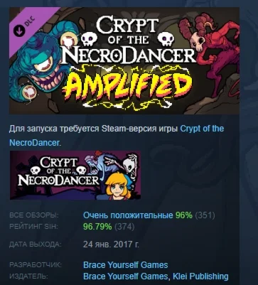 Crypt of the NecroDancer: APLIFIED – это дополнение-приквел к основной игре Crypt of the Necrodancer. Играй за новую героиню-оборотня Ноктюрну. Пройди новые шокирующие уровни, победи новых боссов и исследуй новый контент!