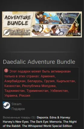 Включенные товары (5): Deponia, Edna & Harvey: Harvey's New Eyes, The Dark Eye: Memoria, The Night of the Rabbit, The Whispered World Special Edition