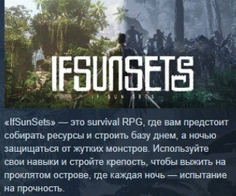 «IfSunSets» — это survival RPG, где вам предстоит собирать ресурсы и строить базу днем, а ночью защищаться от жутких монстров. Используйте свои навыки и стройте крепость, чтобы выжить на проклятом острове, где каждая ночь — испытание на прочность.