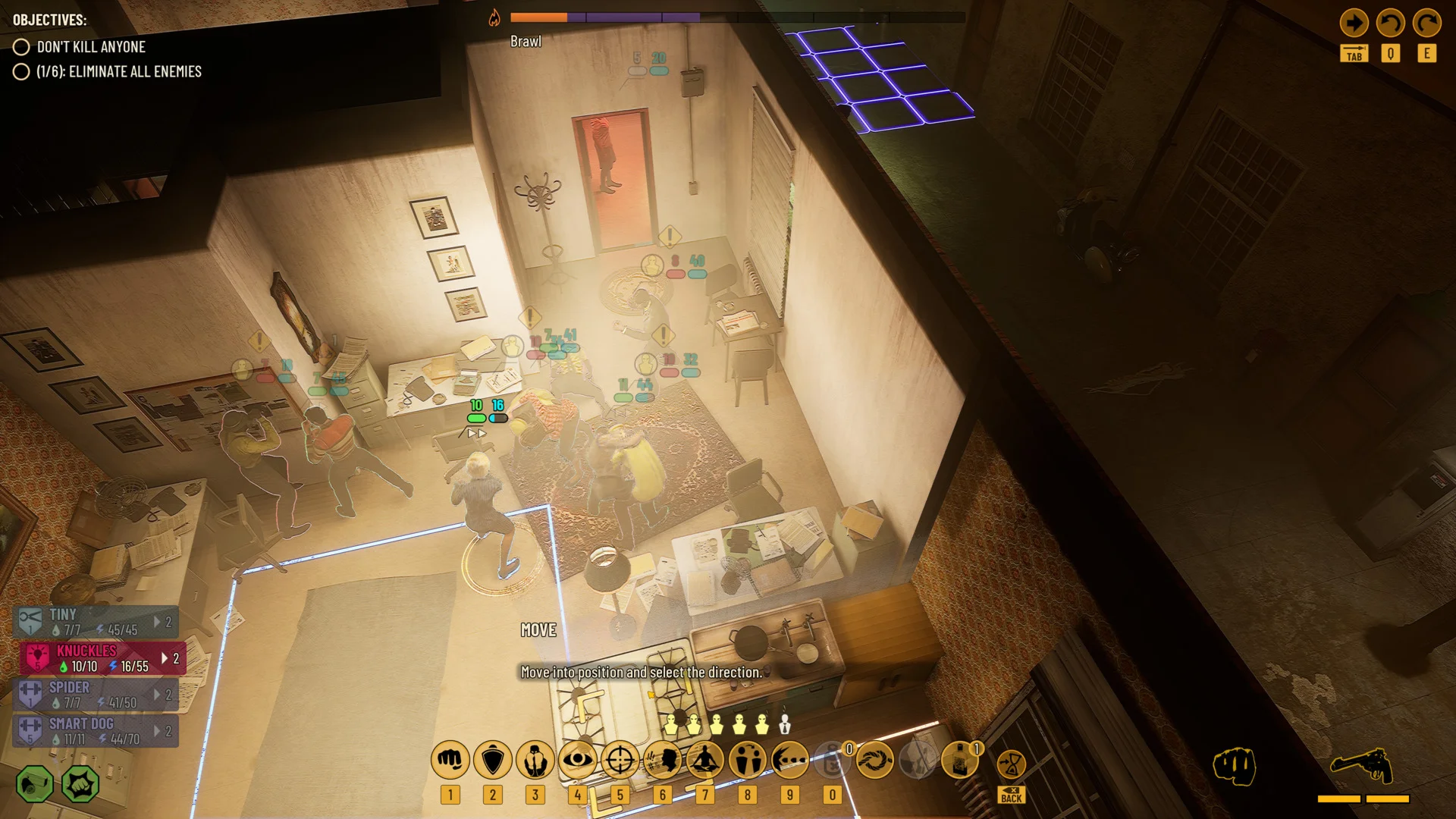 От других игр с пошаговыми сражениями Company of Crime отличается тем, что здесь упор сделан на рукопашный бой и схватки в тесных пространствах. У каждого из ваших подопечных есть зона контроля, поэтому их расположение на многое влияет. Вы можете перекрывать путь противникам, брать врага числом, а также нападать с тыла, получая бонус к атаке. Вы также можете отвесить врагу пинка, чтобы отбросить его в сторону и не дать ударить вашего бойца, когда тот будет проходить мимо. А если кто-то из противников раздобудет пистолет, нужно либо спрятаться, либо отобрать у него оружие, пока он не перестрелял весь ваш отряд.