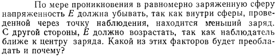 По мере проникновения в равномерно заряженную сферу напряженность Е должна убывать, так как внутри сферы, проведенной через точку наблюдения, находится меньший заряд. С другой стороны, Е должно возрастать, так как наблюдатель ближе к центру заряда. Какой из этих факторов будет преобладать и почему?