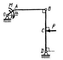 Шарнирный четырехзвенник, весом которого можно пренебречь, находится в равновесии. Определить силу F. если к кривошипу ОА приложена пара сил с моментом М = 10 Н·м, а размеры ОА = 10 см. ВС = CD, угол ?=30о. (Ответ 400)