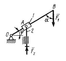 Кулисный механизм находится в равновесии под действием сил F1 = 1 кН и F2. Определить в кН силу давления втулки 1 на вертикальный стержень 2, если углы ? = 30°,?=60°, длины ОА = 0,5 м, ОВ= 1,2м. (Ответ 2,08)