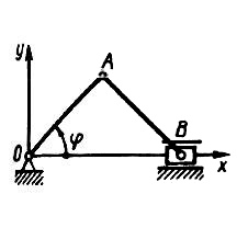 Положение кривошипа определяется углом φ = 0,5 t. Определить скорость ползуна В в момент времени t = 4 с, если ОА = AВ = 1,5 м. (Ответ -1,36)