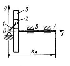 От кривошипа 1 с помощью ползуна 2 приводится в поступательное движение кулиса 3 по закону хА = 0,4 - 0,1 sin t2. Определить скорость точки В кулисы в момент времени t = 2 с. (Ответ 0,261)