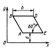 Однородная пластина ABDE имеет вид ромба со стороной b = 0,2 м. Определить координату ус центра тяжести ромба, если расстояние d от основания АЕ до оси Ох равно 0,1 м. (Ответ 0,187)