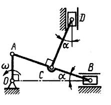 К шатуну АВ в точке С шарнирно прикреплен шатун CD. Для заданного положения механизма определить скорость точки D ползуна, если угол а = 20° . (Ответ 0,582)