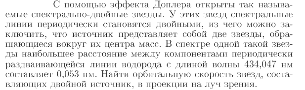 С помощью эффекта Доплера открыты так называемые спектрально-двойные звезды. У этих звезд спектральные линии периодически становятся двойными, из чего можно заключить, что источник представляет собой две звезды, обращающиеся вокруг их центра масс. В спектре одной такой звезды наибольшее расстояние между компонентами периодически раздваивающейся линии водорода с длиной волны 434,047 нм составляет 0,053 нм. Найти орбитальную скорость звезд, составляющих двойной источник, в проекции на луч зрения.