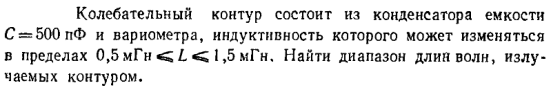 Колебательный контур состоит из конденсатора емкости С = 500 пФ и вариометра, индуктивность которого может изменяться в пределах 0,5 мГн < L < 1,5 мГн. Найти диапазон длин волн, излучаемых контуром.