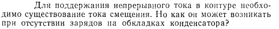 Для поддержания непрерывного тока в контуре необходимо существование тока смещения. Но как он может возникать при отсутствии зарядов па обкладках конденсатора?