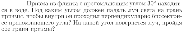 Призма из флинта с преломляющим углом 30° находится в воде. Под каким углом должен падать луч света на грань призмы, чтобы внутри он проходил перпендикулярно биссектрисе преломляющего угла? На какой угол повернется луч, пройдя обе грани призмы?