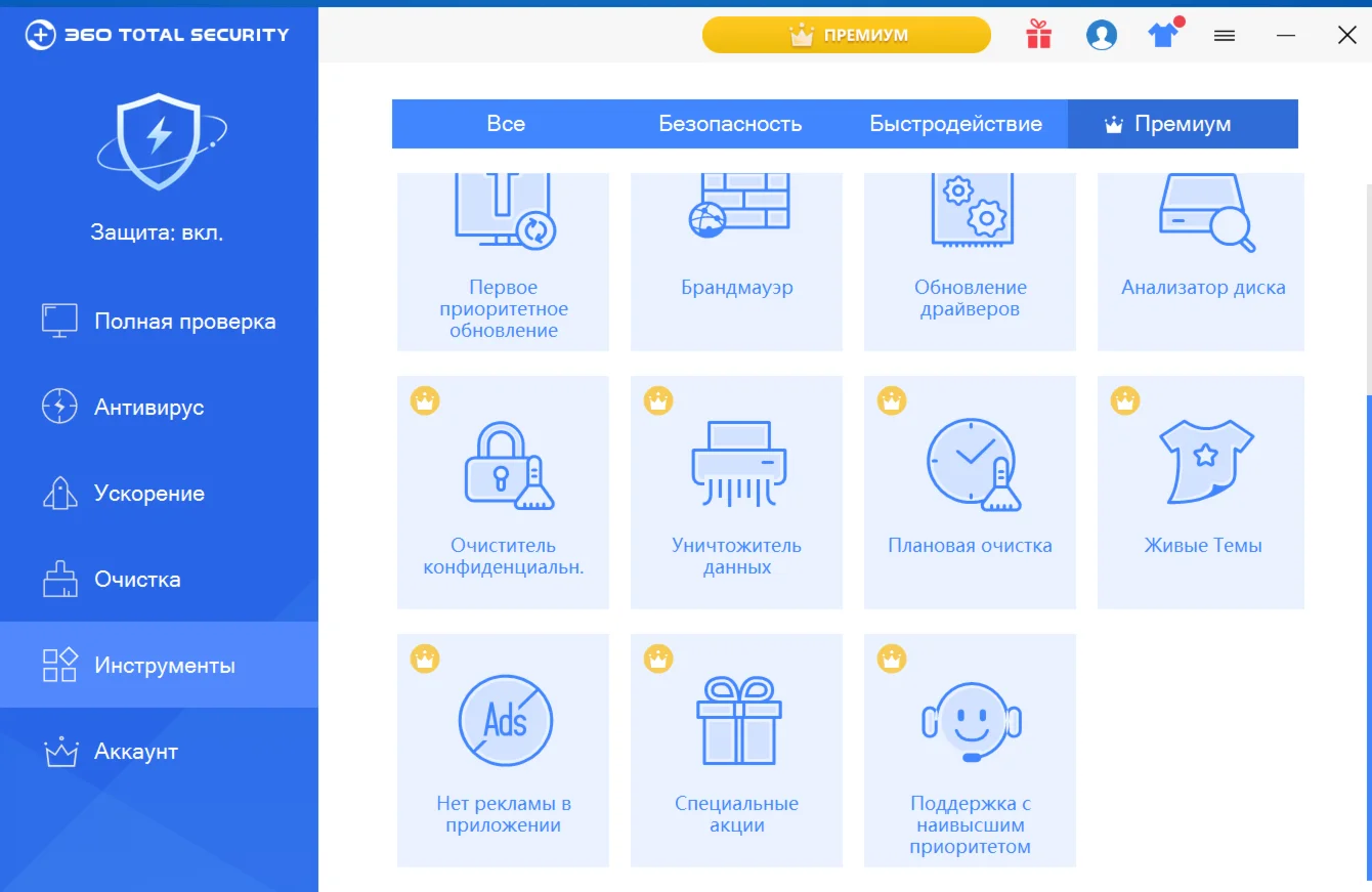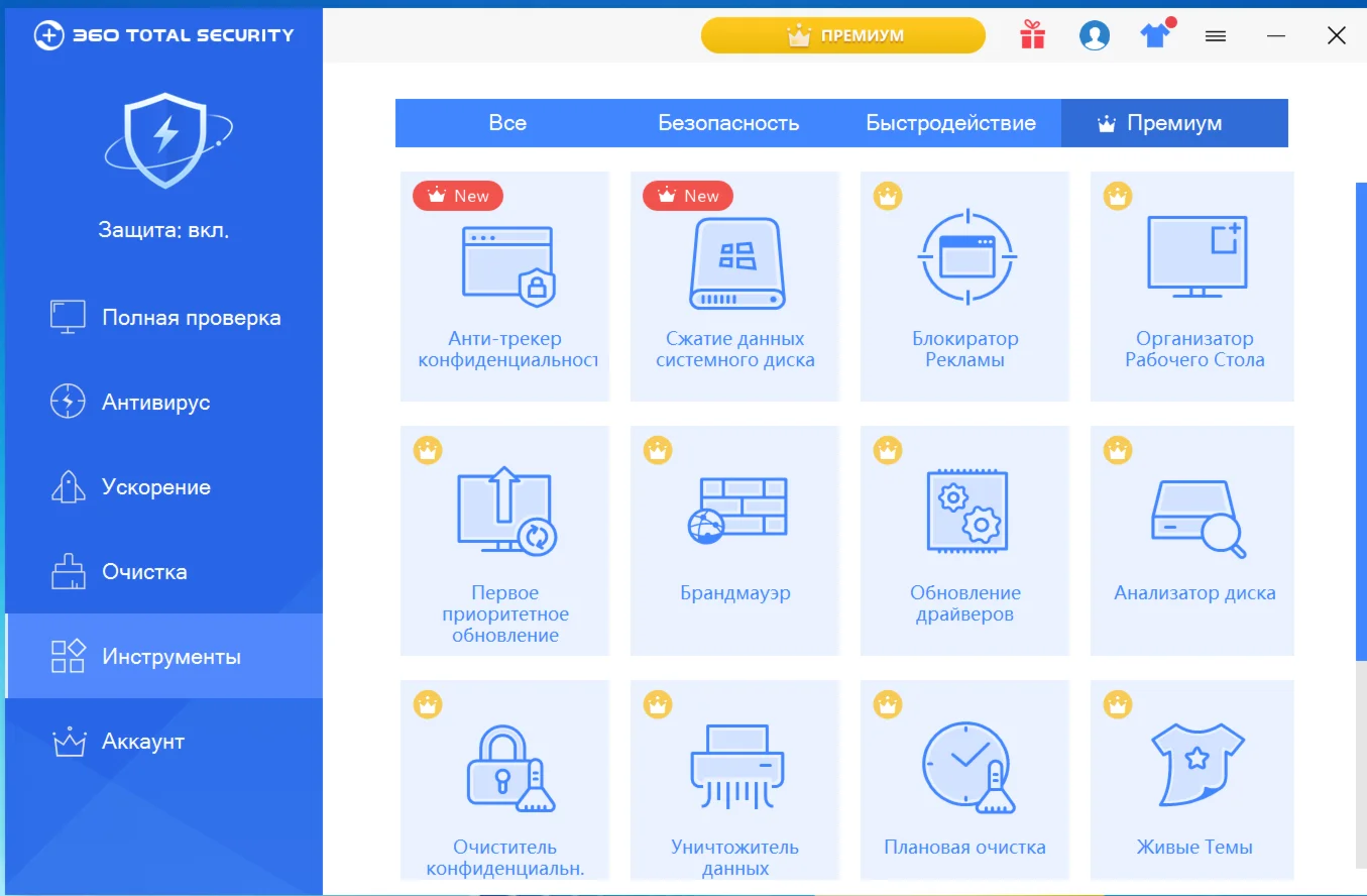 360 Total Security Premium — зарекомендовал себя, как мощный защитник информации и железа миллионов пользователей по всему миру. Дружелюбный интерфейс — даже школьник легко может разобраться в настройках и управлении. Многозадачный — выполняет сразу три функции: работаем как антивирус в штатном режиме, ускоряет и оптимизирует работу PC, удаляет мусор и чистит реестр. При столь обширном функционале практически не загружает оперативную память и процессор, работая себе спокойно в фоновом режиме. Уникальный инструмент — песочница. В нем вы можете смело открывать и запускать любые программы, которые не могут навредить вашей системе, пока находятся в SandBox.