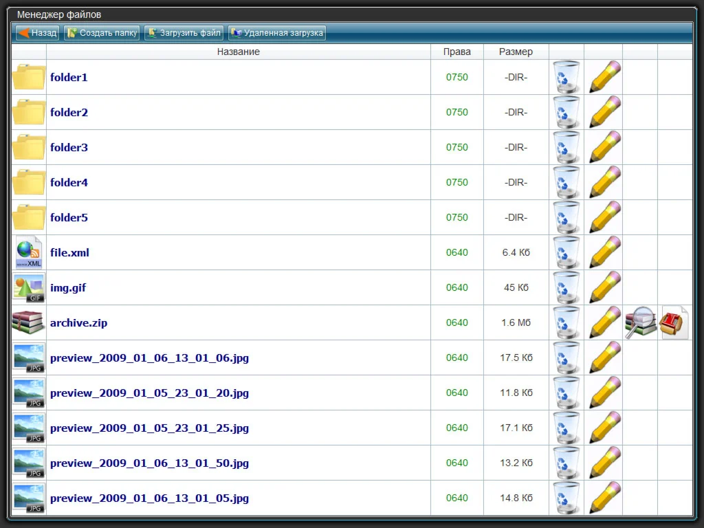Файл-менеджер со способностью просмотра и распаковки ZIP-архивов прямо на сайте. Различает форматы файлов (*.mp3, *.wav, *.wma, *.exe, *.bat, *.reg, *.sql, *.xml, *.txt, *.doc, *.xls, *.ace, *.rar, *.zip, *.avi, *.mpg, *.mpeg, *.mov, *.swf, *.php, *.js, *.css, *.pl, *.inc, *.html, *.dll, *.db, *.gif, *.jpg, *.bmp, *.png, *.tiff, *.psd) Посмотреть DEMO можно по адресу: http://fileman.barboss.net.ru/fileman.php