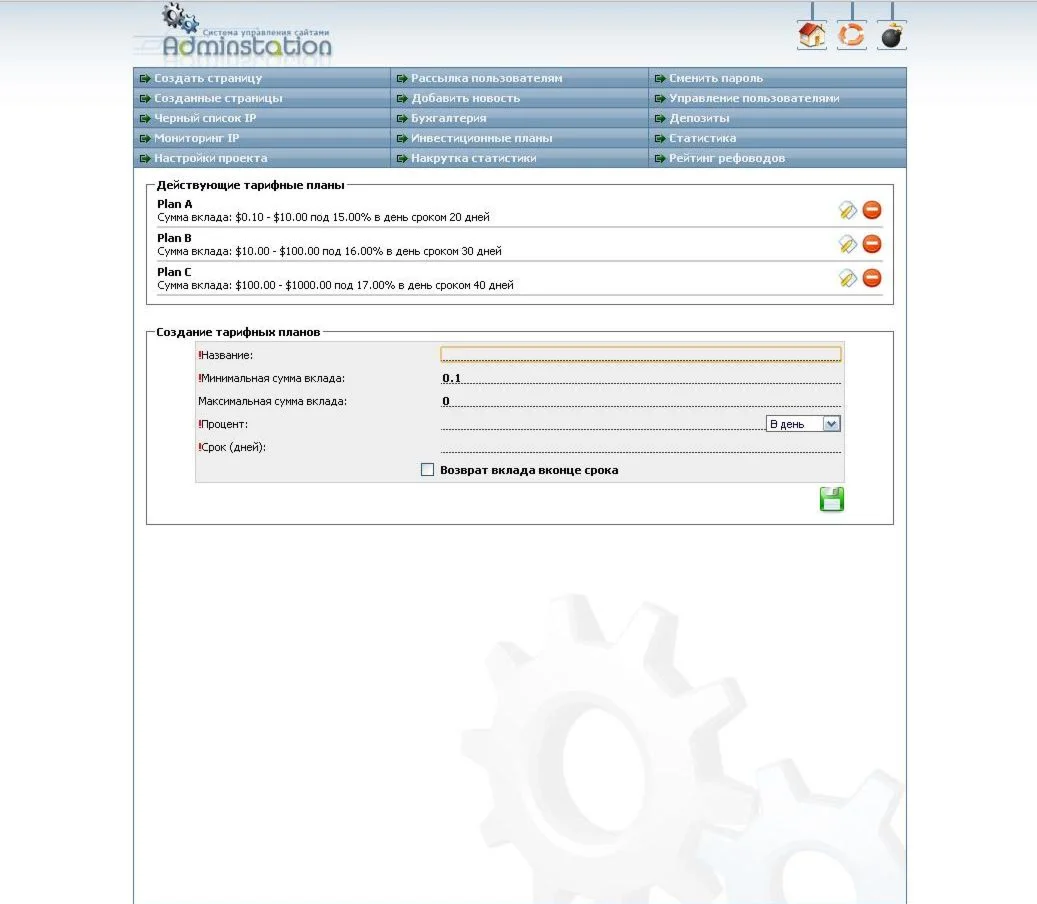 Имеется возможность настройки любых инвестиционных планов, процент реферальной программы, авто зачисление и автоматический вывод средств.