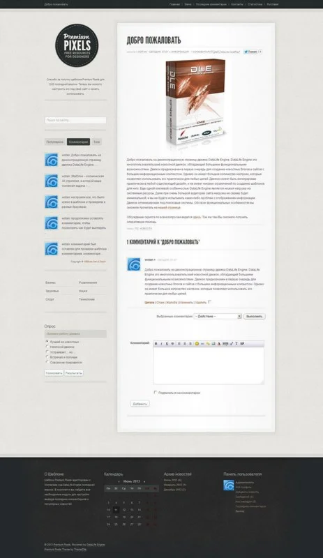 Переделанный шаблон Premium Pixels с WordPress под DataLife Engine. В шаблоне использованы два модуля BlockPro и IComm. Модули распространяются бесплатно и регулярно обновляются, у вас не должно возникнуть проблем с обновлением. Шаблон в две колонки и вы можете менять из местами, как это сделать вы сможете узнать из инструкции, которая идет в комплекте.