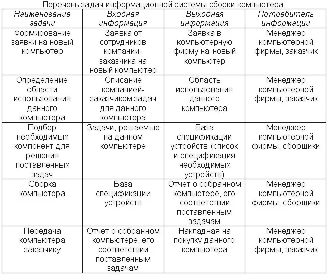 Система предполагает решение следующих задач: формирование заявки на новый компьютер, определение области использования данного компьютера, подбор необходимых компонент для решения поставленных задач, сборка компьютера, передача компьютера заказчику. Перечень решаемых задач в процессе работы информационной системы сборки компьютера, перечень входной и выходной информации приведены в таблице (смотрите приложенный рисунок).