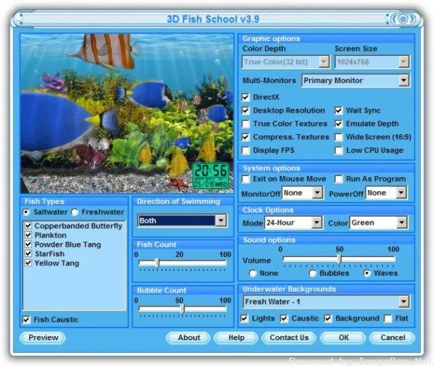 Заставка в виде аквариума с красивыми тропическими рыбками. Возможность добавлять новых рыбок, а также можно применить несколько водных "тем" (голубая вода, зеленоватая и т.п.)