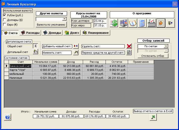 • Вести учет движения денежных средств на своих счетах (банковские счета и карты, мобильный телефон, наличные и т. д.) во всех основных видах валюты, начиная с рубля, доллара, евро и кончая китайскими юанями и японскими йенами; также возможно использование украинских гривен, белорусских рублей и казахских тенге;