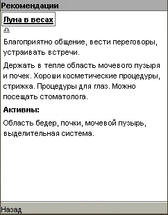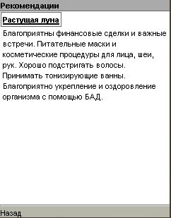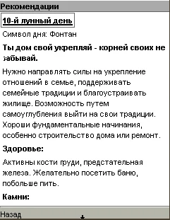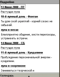 Программа содержит описание лунных дней и положение луны в знаках зодиака на каждый день 2008 года, а также приводятся конкретные рекомендации на каждый день.