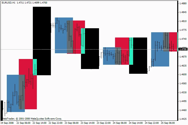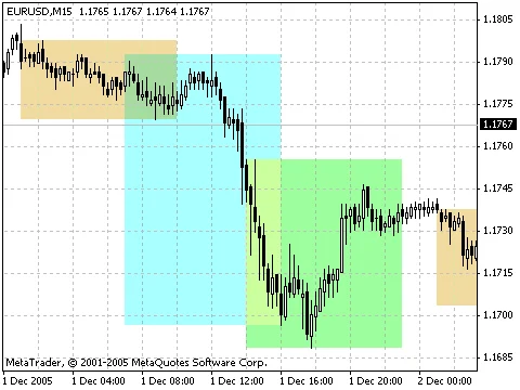 Индикатор "Market Time" - показывает начала и окончания трёх торговых сессий: азиатской, европейской и американской. Сессии отображаются фоновыми прямоугольниками. Длина прямоугольника соответствует длительности торговой сессии, а высота - торговому диапазону.