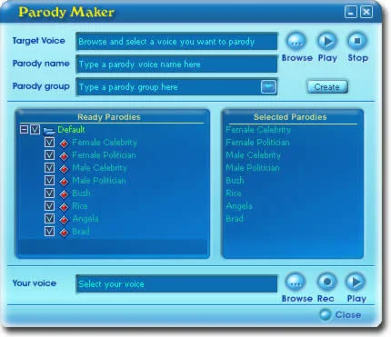 Voice Changer Software может создать разные голоса для фильмов, аудиоклипов и презентаций. Она может записать ваш измененный голос в реальном времени или изменить уже записанный аудиофайл. Поддерживается запись голоса из потоковых аудио- и видеоисточников. Программа совместима со всеми аудиоплеерами: Windows Media Player, Winamp, RealOne Player, Music Match, Music Jukebox, PowerDVD, WinDVD, Zoom Player, BlazeDVD, Hero DVD Player, а также караоке-проигрывателями и Интернет-радио.