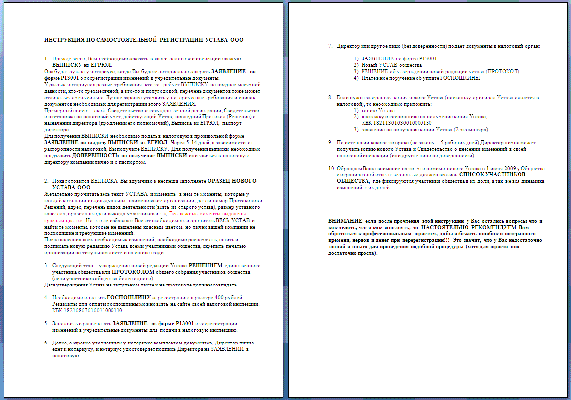 Если Вы ищите образец нового Устава ООО, то предлагаем Вам следующий вариант: Вы покупаете образец нового Устава ООО, разработанный юристами в соответствии с новыми законами 312-ФЗ и 205-ФЗ, самостоятельно вносите в него свои данные, и затем регистрируете его в своей налоговой инспекции, используя подробную пошаговую инструкцию, приведенную в конце Устава. Устав содержит 18 страниц и полностью отвечает требованиям новых законов. Данные которые необходимо изменить выделены красным цветом.