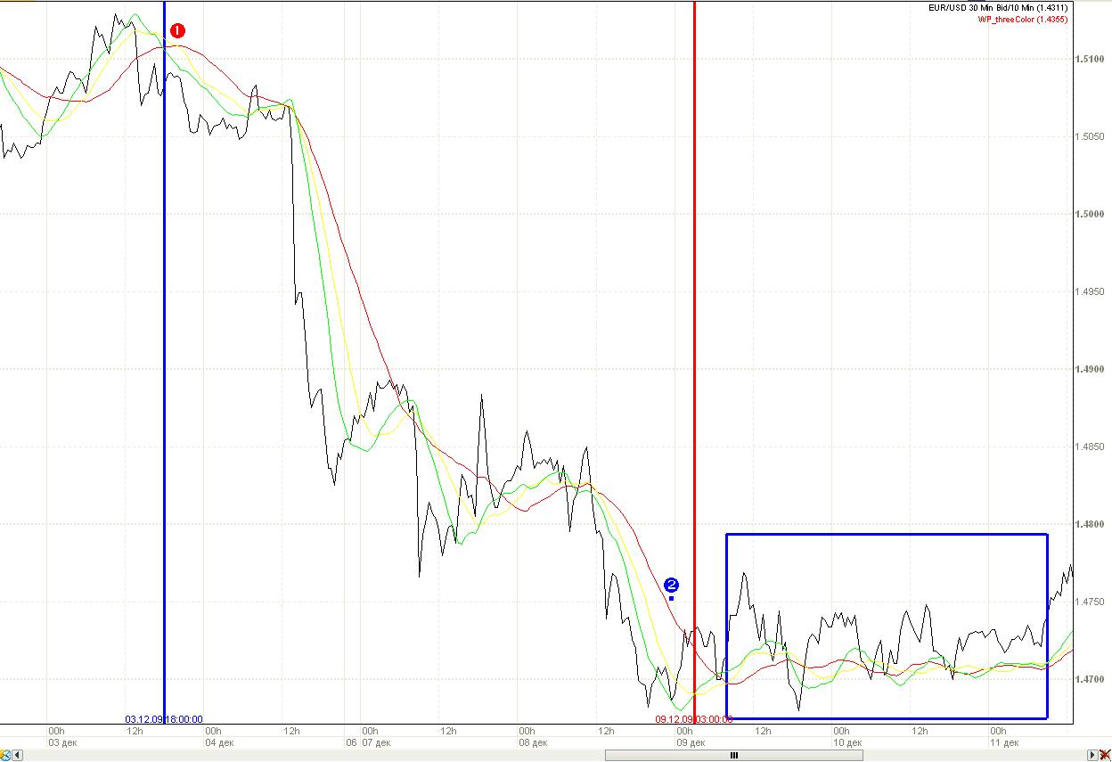 Работа достаточно проста и хорошо видна на графике. Индикатор срабатывает когда все три линии –красная, желтая, зеленая – пересекают черную торговую ломаную линию и переворачиваются (кружок с цифрой 1), т.е. красная линия пересекает две других сверху вниз либо наоборот. Завершает тренд – новое пересечение всех трех линий черной и очередной переворот цветных. Красная сверху – тренд направлен вниз, красная снизу – тренд идет вверх.