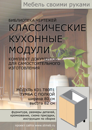 Полный пакет профессионально подготовленных чертежей и спецификаций для самостоятельного изготовления кухонного модуля Т80П1 (Тумба шириной 80 см с полкой). Размеры деталей, кромкование, схемы присадки деталей и фасадов, список фурнитуры, инструкция по сборке и рекомендации по установке. Никаких знаний графических программ не требуется, пакет сделан по технологии скачал - распечатал - сделал.
