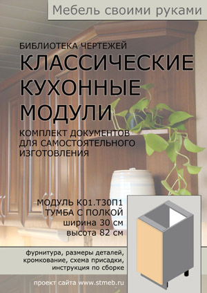 Полный пакет профессионально подготовленных чертежей и спецификаций для самостоятельного изготовления кухонного модуля Т30П1 (Тумба шириной 30 см с полкой). Размеры деталей, кромкование, схемы присадки деталей и фасадов, список фурнитуры, инструкция по сборке и рекомендации по установке. Никаких знаний графических программ не требуется, пакет сделан по технологии скачал - распечатал - сделал.