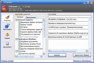 Утилита для чистки системного "мусора", которая находит и удаляет временные и неиспользуемые файлы, в том числе: cookies, историю посещения сайтов в IE, временные файлы Интернета, строки поиска, файлы Корзины и т. д.