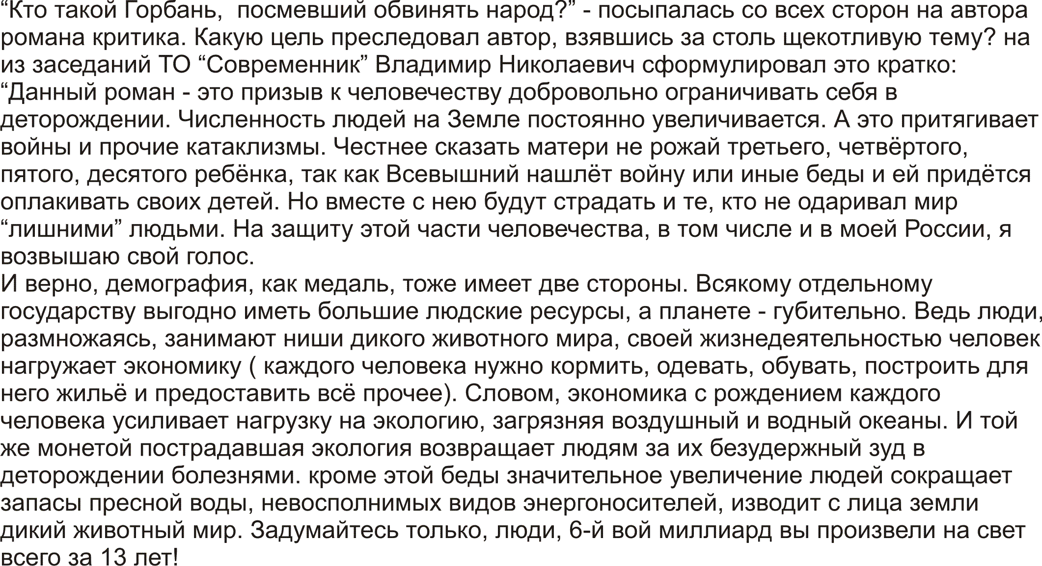Данный роман-это призыв к человечеству добровольно ограничивать себя в деторождении.