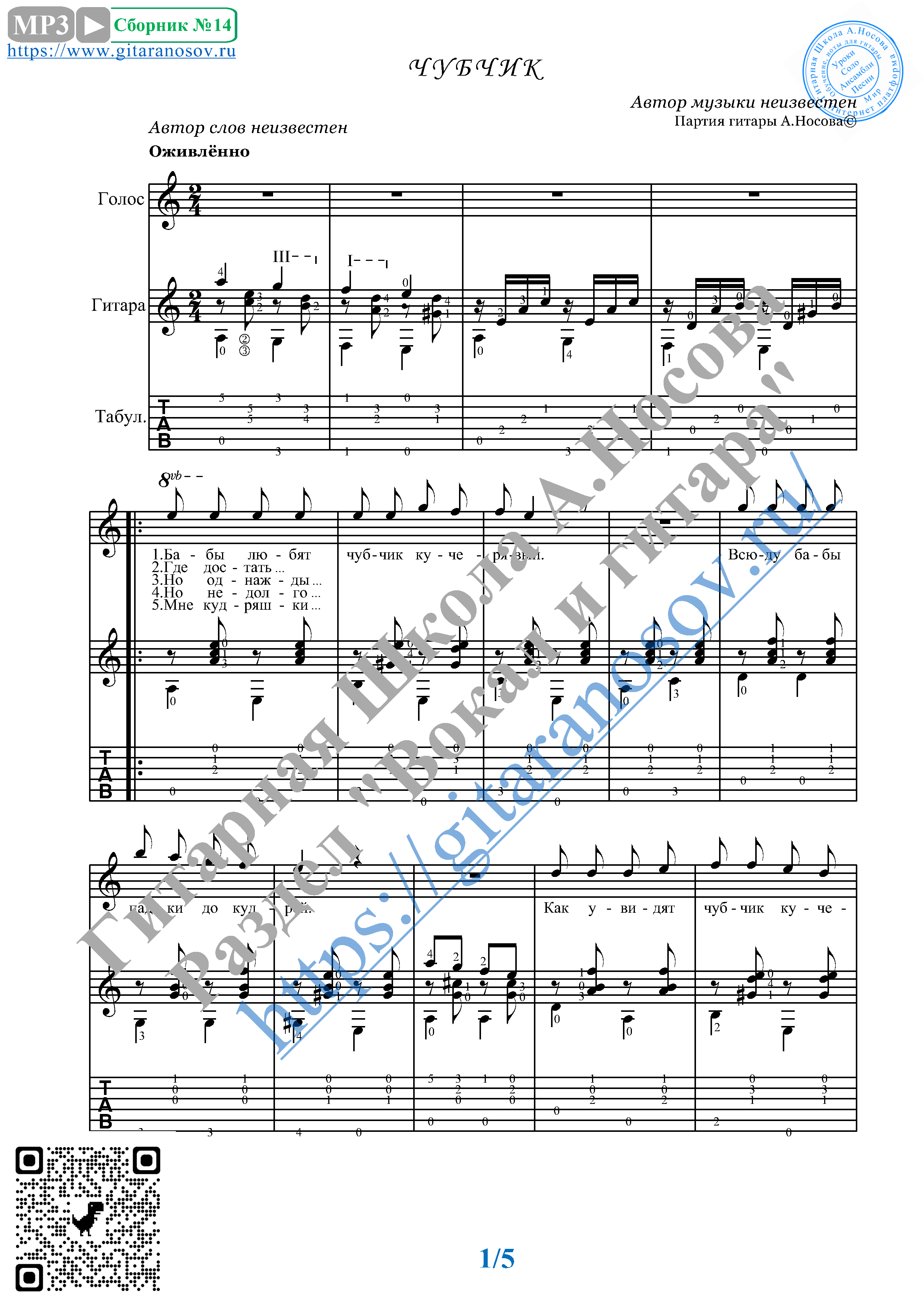 Вашему вниманию предлагается композиция "Чубчик (автор неизвестен)", предназначенная для вокала в сопровождении 6-ти струнной гитары (pdf / png*). Запись выполнена нотами и включает в себя партию вокала с подтекстовкой, партию гитары с подробнейшей аппликатурой, текст песни (НА РУССКОМ ЯЗЫКЕ). Партия гитары продублирована табулатурой. Прилагается ссылка на скачивание mp3. *По просьбе покупателя.