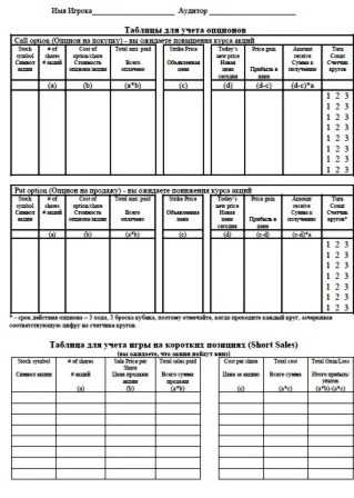 2. Бланк учета опционов и коротких позиций, односторонний, используется только в игре Cashflow 202.